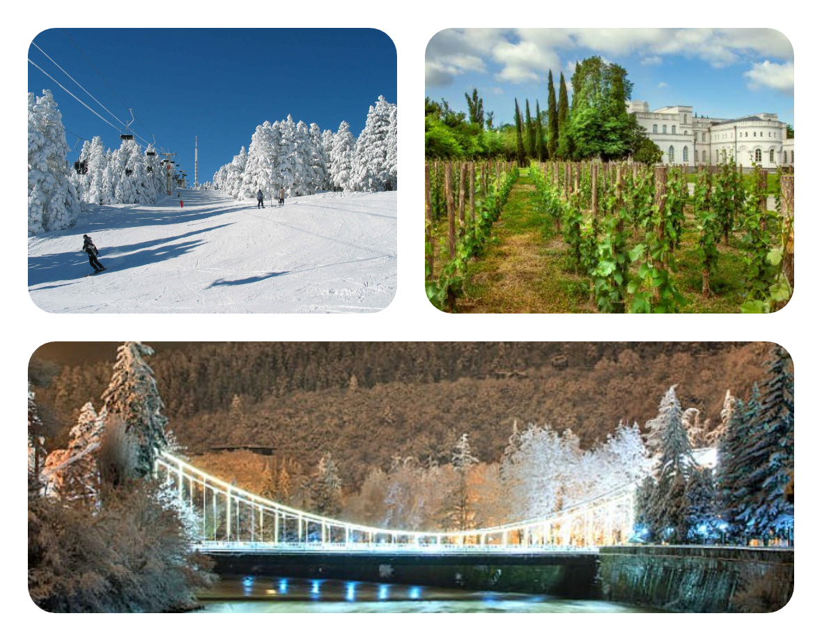 თქვენი მოგზაურობა იწყება საქართველოს სამეფო ოჯახის მემკვიდრის, მუხრანელ უფლისწულის მიერ 1878 წელს დაარსებულ „შატო მუხრანის“ ღვინის ქარხანაში, სადაც ნახავთ ივანე მუხრანბატონის სამეფო სასახლეს, ბაღს, ძველ მარანს, გაისეირნებთ ვენახებში და მოინახულებთ ულტრათანამედროვე ღვინის ქარხანას. გექნებათ შესაძლებლობა დააგემოვნოთ ქართული ღვინის საუკეთესო სახეობები. შემდეგ გავემგზავრებით სამხრეთ საქართველოში, კურორტ ბორჯომის მიმართულებით, გზად მოვინახულებთ მარან "ვილა რბონას", რომელიც მდებარეობს სოფელ რბონაში, მტკვრის მარჯვენა სანაპიროზე, ხაშურიდან 9 კმ და ბორჯომიდან 23 კმ.ტერიტორიაზე არის მარანი, ვენახი, თონე, პათიო, ფანჩატური, საცეცხლე და კემპინგის სივრცეები, აქვე გვექნება 3 სახეობის ღვინის და არაყის დეგუსტაცია. დეგუსტაციის შემდეგ ჩავალთ ბორჯომში. ბორჯომი ცნობილია ბუნებრივი ვულკანური მინერალური წყლით „ბორჯომით, რომელსაც ჩასვლისთანავე დავაგემოვნებთ. ბორჯომში არის ევროპის ერთ-ერთი უდიდესი ტყე-პარკი, სადაც შეგიძლიათ გაისეირნოთ ცხენებით ან კვადროთი. ბორჯომის შემდეგ გავემგზავრებით ბაკურიანის სამთო-სათხილამურო კურორტზე, სადაც შეგიძლიათ იქირაოთ სნოუბორდი, გამოსცადოთ ბაკურიანის სათხილამურო ტრასა, დატკბეთ ლამაზი ხედებით. ბევრი თავისუფალი დრო გექნებათ მინერალური წყლების დასაგემოვნებლად, ჭამისთვის და საყიდლებისთვის. ღამე დავრჩებით ბაკურიანში.